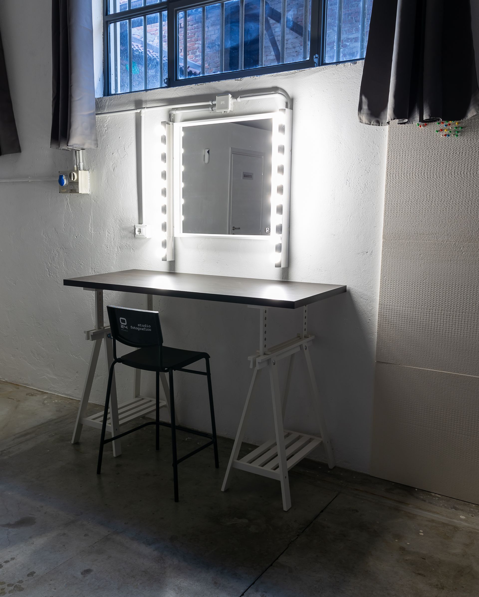 Lo studio è completo di zona make-up e tutto il necessario per il lavoro degli stylist come stand, grucce, steamer a vapore.